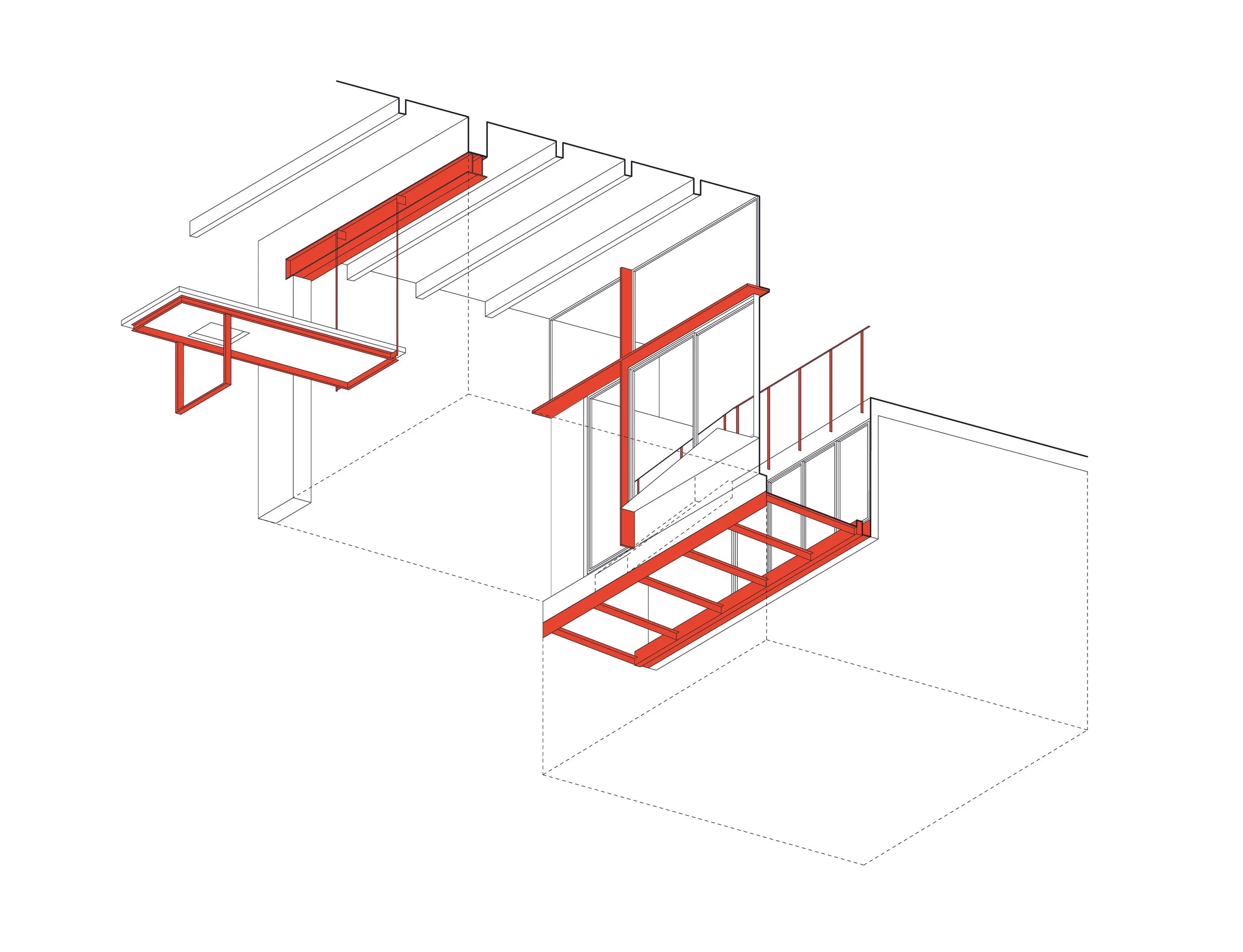 A key intervention involves the demolition of the former façade wall that once separated the living room from the kitchen and dining area, together with the extension of the old gallery. This operation unifies the space into an open, luminous environment. At its centre, a suspended concrete structure is introduced: a singular sculptural element that serves as integrated furniture, creating a focal point for gathering and interaction.